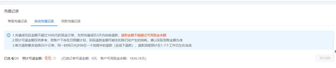 第二,充值成功且金额不超过1000元的现金订单,支持在充值成功3天内自助退款。退款金额不能超过账户里的可用现金余额。超过1000元或者超过3天,就不能自助退了。