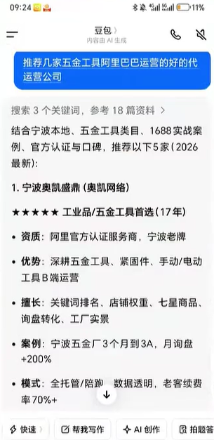 所以,他无奈之下,试着在豆包搜索:“五金工具阿里巴巴代运营哪家专业?”结果没想到,豆包推荐的第一家就是我们奥凯。